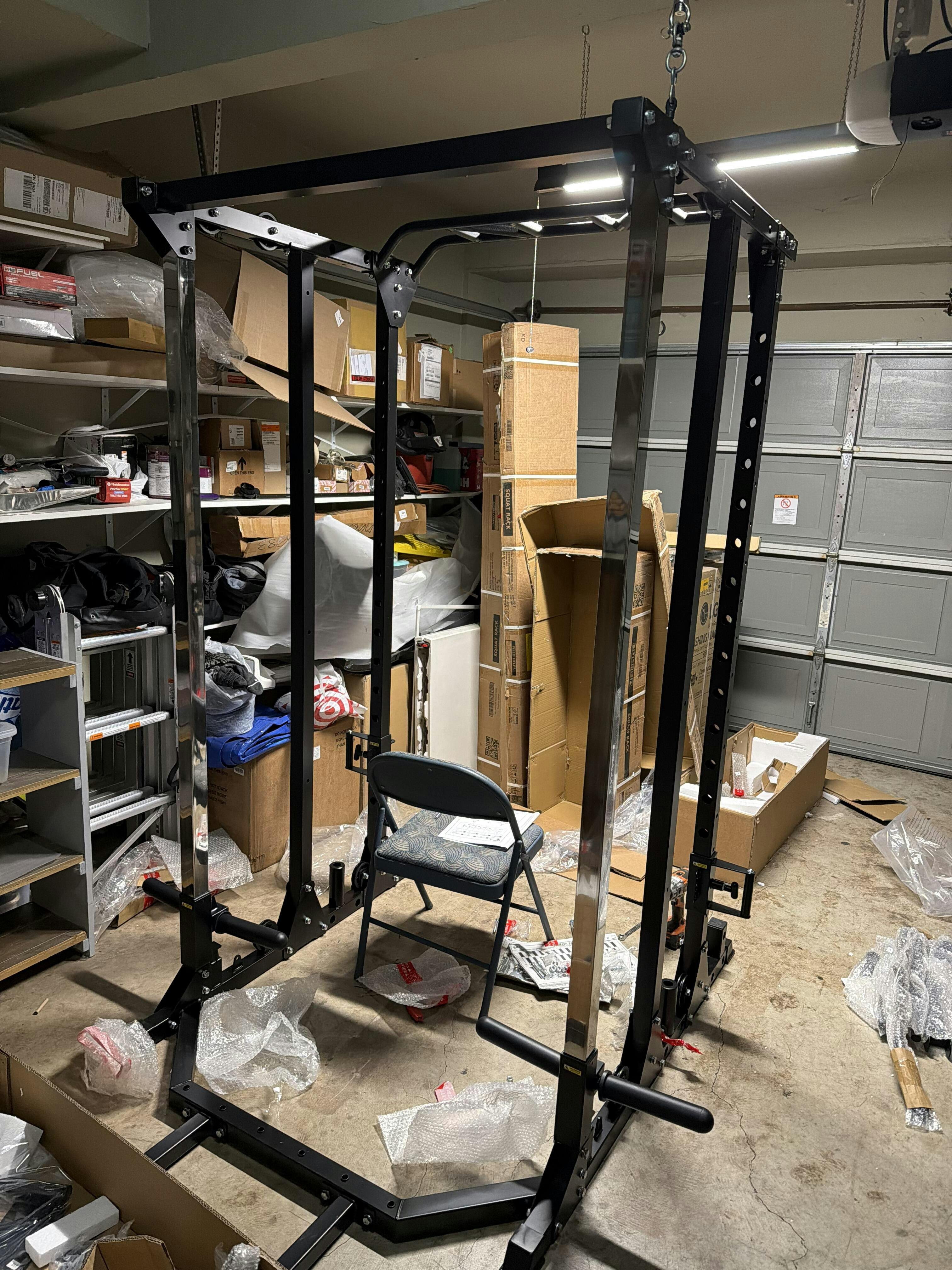 This isn’t just a Smith Machine, functional trainer, and power rack in one frame—it also comes loaded with 10 essential attachments so you’re ready to train from day one. Included: pull-up bar, low row foot pedal, lat pulldown seat, J-cups, tricep rope, landmine, lat pulldown bar, cable bar, T-bar, and dip bar.